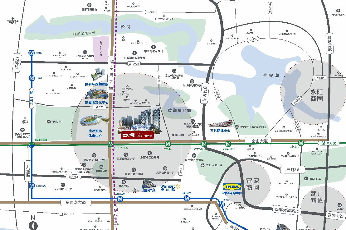政务:东西湖新政府大楼,财政局,教育局,社保局,会议中心,人民法院,五环体育中心、东西湖文化中心